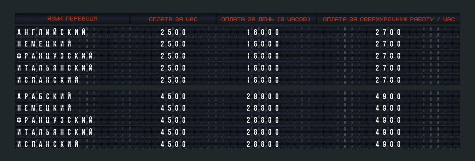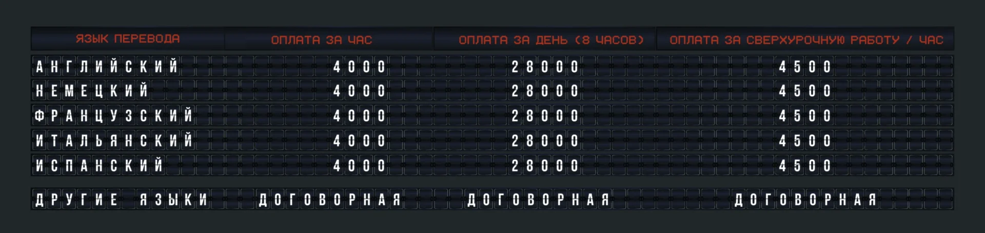 Язык перевода Оплата за час Оплата за день (8 часов) Оплата за сверхурочную работу / час